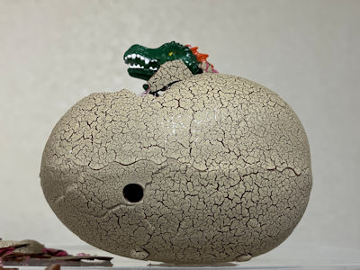スピノサウルスの卵に付属の注射器でワニのDNAに見立てた水を注入するとハイブリッド恐竜のスピノダイルが孵化するという玩具で、孵化は一度しかできません。注入前に注射器を振ると水に青い色が着くのが芸が細かいと思いました。